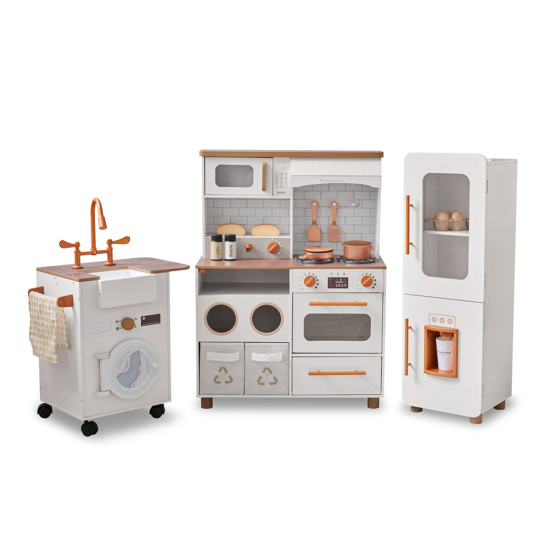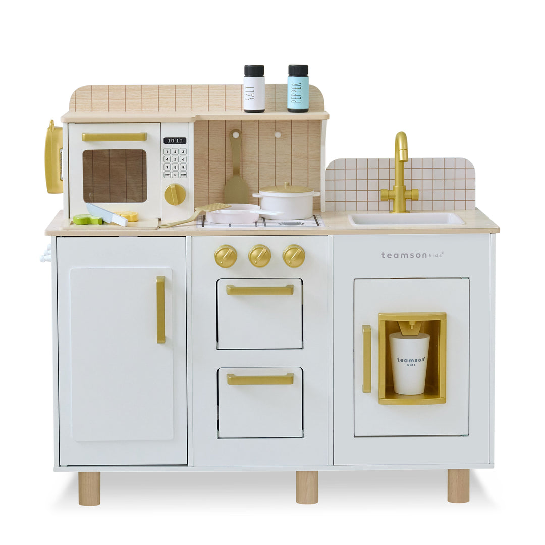 A TEAMSON KIDS - LITTLE CHEF ATLANTA LARGE MODULAR PLAY KITCHEN, WHITE/GOLD with modern appliances and accessories.