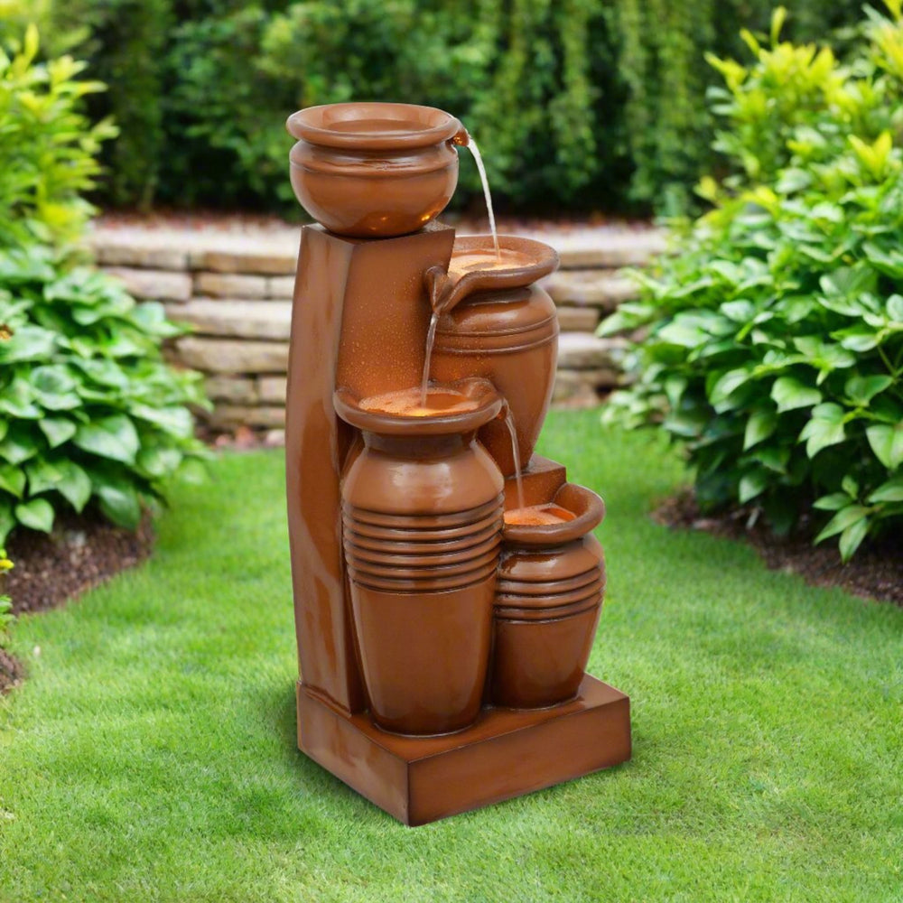 Teamson Home 30.71" 4-Tier Outdoor Solar Water Fountain with LED Lights, Terracotta with cascading pots on a white background.