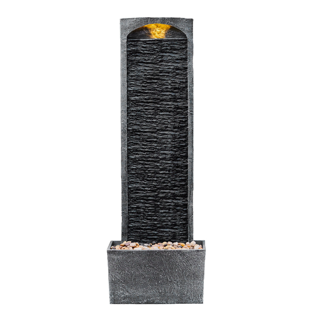 A waterfall fountain, charcoal, with LED lights illuminated at the top and bottom, on a patio.
