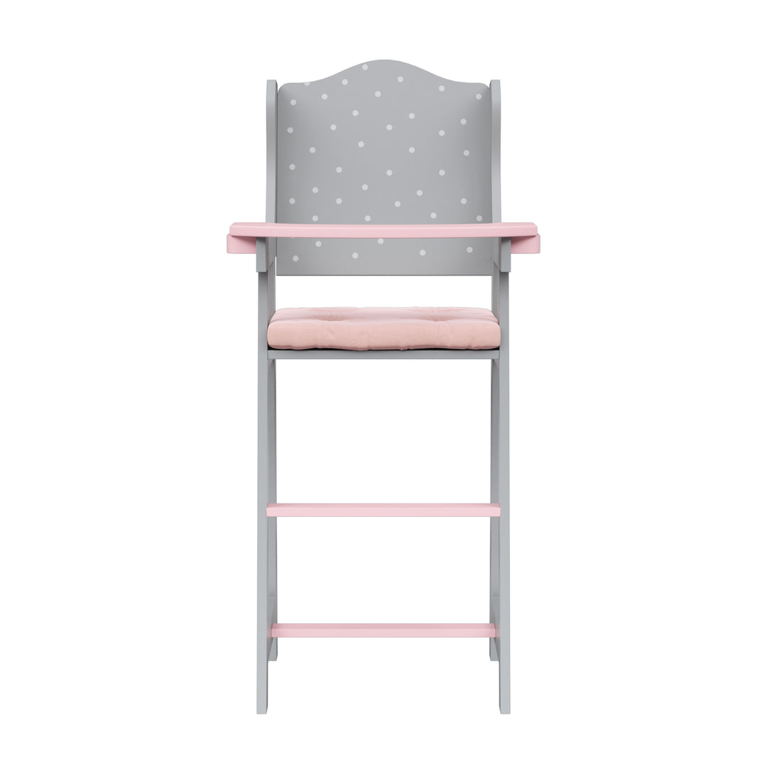 A pink and grey Olivia's Little World Polka Dots Princess Kids Baby Doll High Chair, Gray.