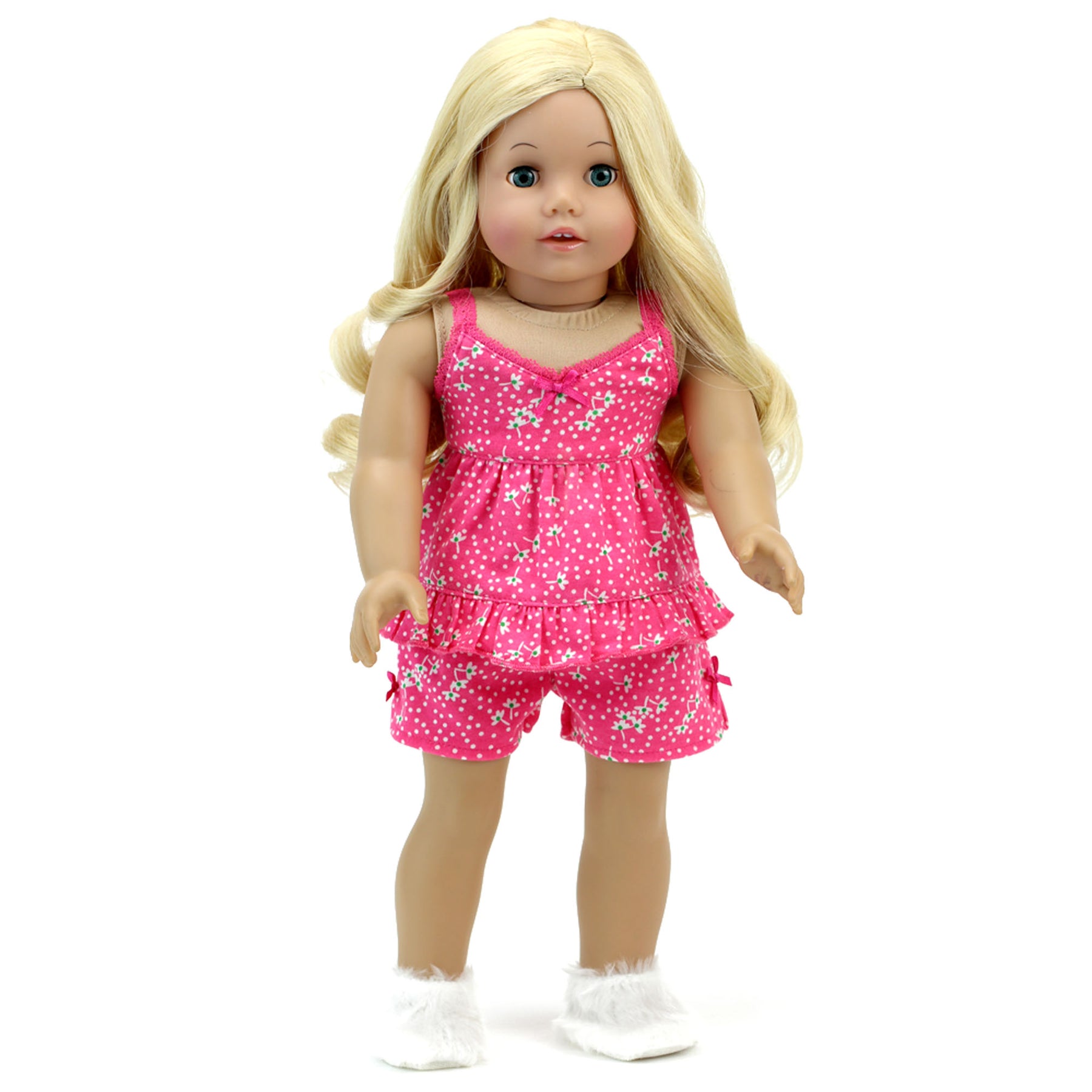 Sophia's floral print sleepwear set features a fun, hot pink print camisole top and matching shorts, trimmed in lace and ribbon. The top is styled with an empire waist and pleated ruffle for a finished look that could be mixed and matched with other pieces in your 18" dolls existing wardrobe. Easy to get on and off, it includes hook and loop closure on the back. Includes a pair of fluffy white slippers, too. Perfectly styled to fit Sophia's dolls and other 18" dolls from most leading brands (doll not included), makes a great gift.