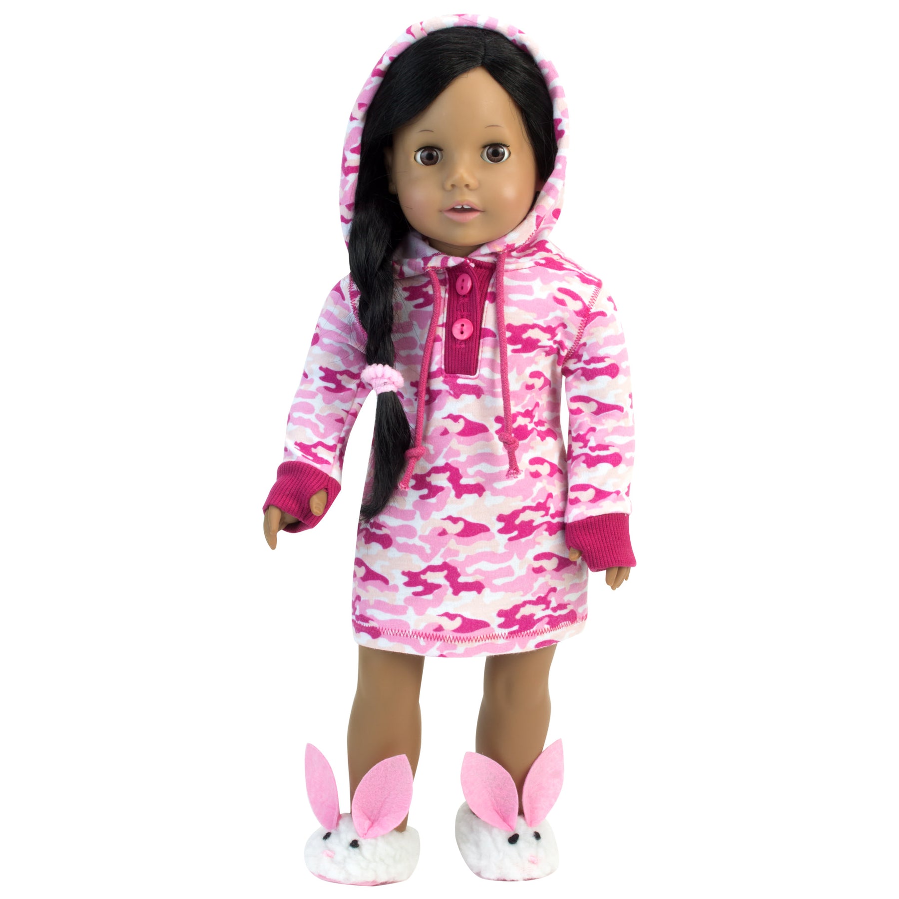 - INCLUDED: One pair of white bunny slippers with pink ears sized for 18 inch dolls.