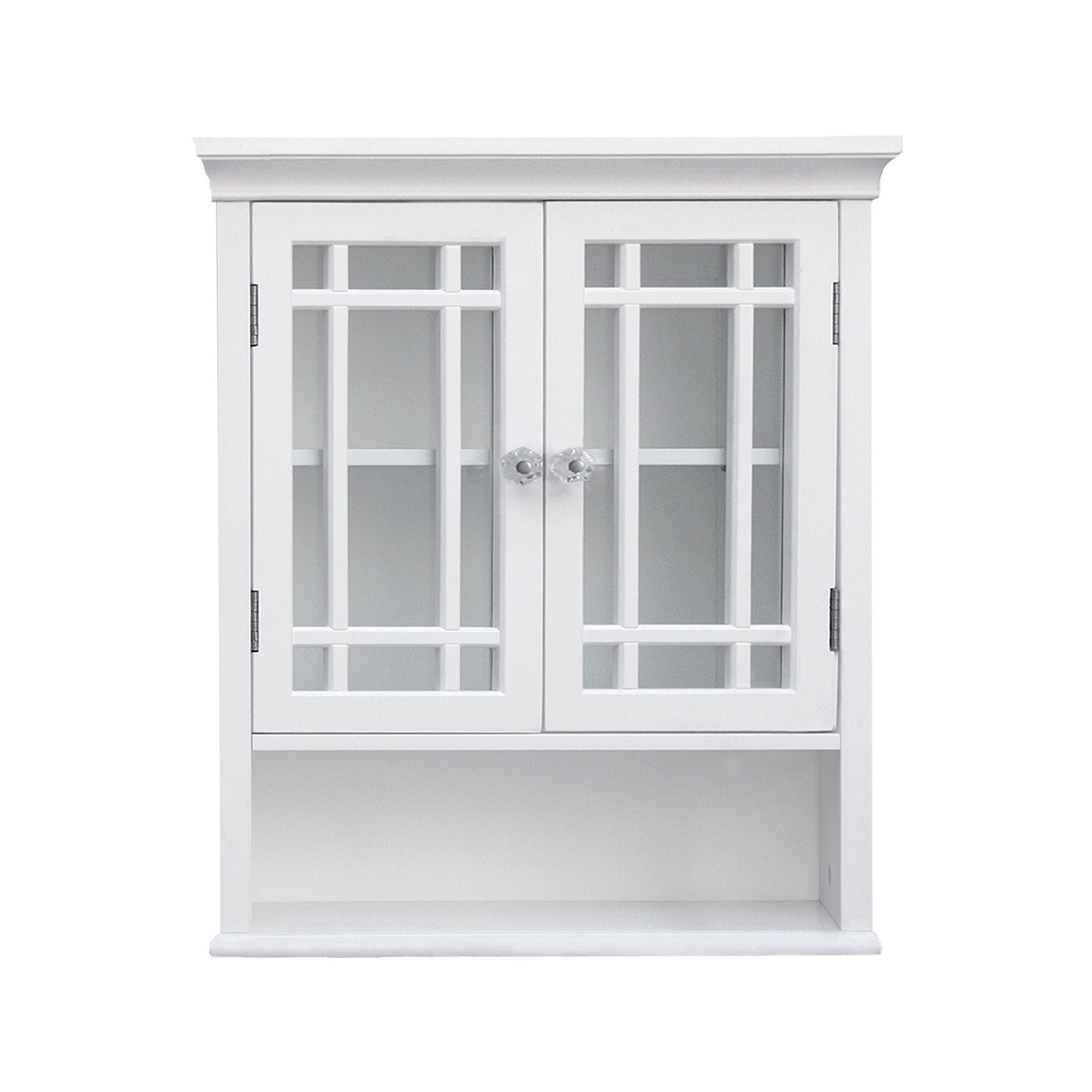 Teamson Home's Neal Two-Door Removable Wall Cabinet features a fresh white finish for a decorative storage solution. The cabinet doors feature glass panels under a prairie-style grid, while a fixed open shelf below for easy access. Inside, an adjustable shelf helps keep countertops clutter-free, while magnetic latch operate silently, eliminating clicking or slamming noises and keeping doors securely shut.