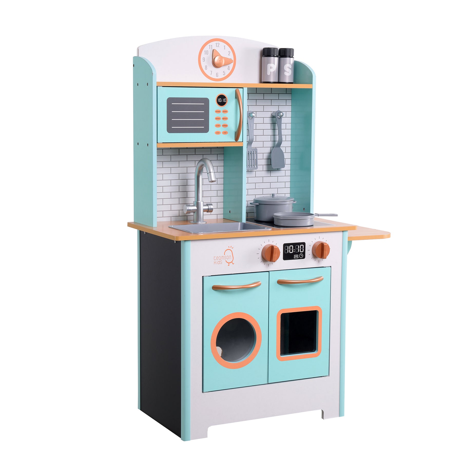Playfully chic, this Little Chef Santos Small Retro Play Kitchen revives any playroom with a vibrant burst of color and endless play opportunities. Perfect for small-space areas with its compact design, Santos is packed with plenty of interactive features to keep kids entertained and engaged in constructive screen-free pretend play, including two chalkboard panels, clicking and turning oven knobs, rotating faucet handles, and an adjustable toy analog clock. An extending countertop ensures kids have all the prep space they need to create their gourmet meals, while the multiple storage options keep the included play kitchen accessories neat and organized when playtime is over. The rich aqua tones are fabulously complemented by the white faux subway tile backsplash, natural wood-colored counter, and a mix of both gold and silver accents.